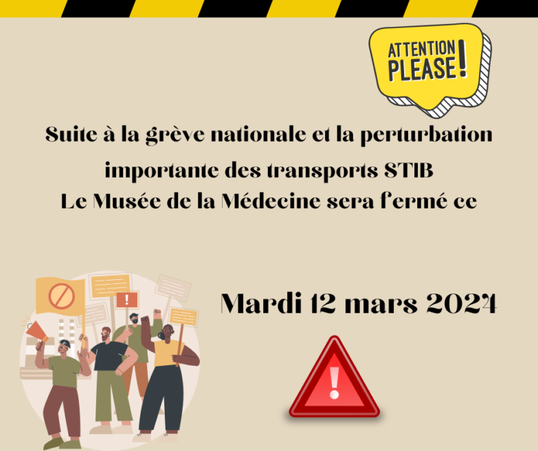 Exceptionnellement en raison de la manifestation nationale et des perturbations du réseau STIB, le Musée de la Médecine sera fermé ce mardi 12 mars 2024. Nous nous excusons de la gène occasionnée. Bonne journée.