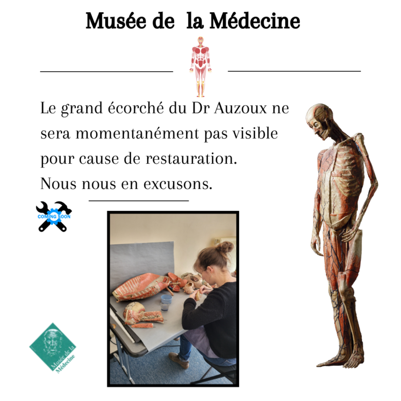 Nous avertissons nos visiteurs que le Grand écorché du Dr Auzoux ne sera pas visible pour cause de restauration en court. Nous vous tiendrons informé dès son retour dans la salle. Merci de votre compréhension