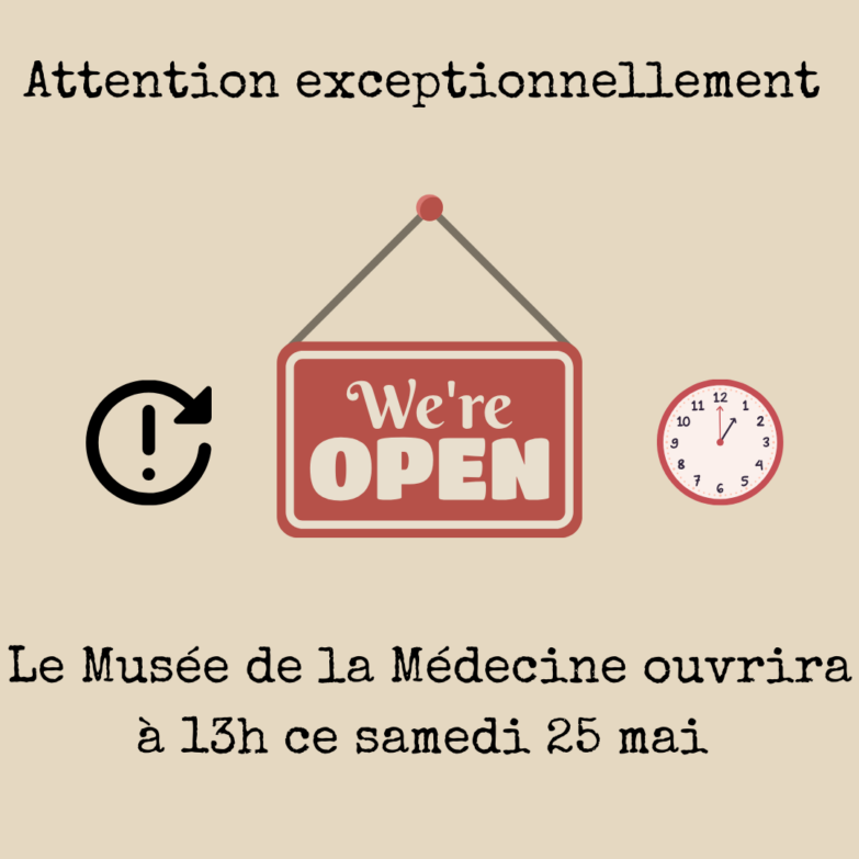 ATTENTION exceptionnellement ce samedi 25 mai 2024, le Musée de la Médecine n’ouvrira ses portes qu’à 13h00. Le dimanche nous vous accueillerons à nouveau de 12h à 16h00. Merci de votre compréhension. 😇
