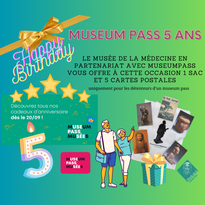 Museum Pass fêtera ses 5 ans le 20 septembre 2023. A cette occasion le Musée de la Médecine soutient cet événement en offrant à partir du 20 septembre à tout visiteurs se présentant avec leur Museum Pass, un sac à l’effigie du Musée accompagné de 5 cartes postales !!! Venez visitez nos 7 salles d’expositions…