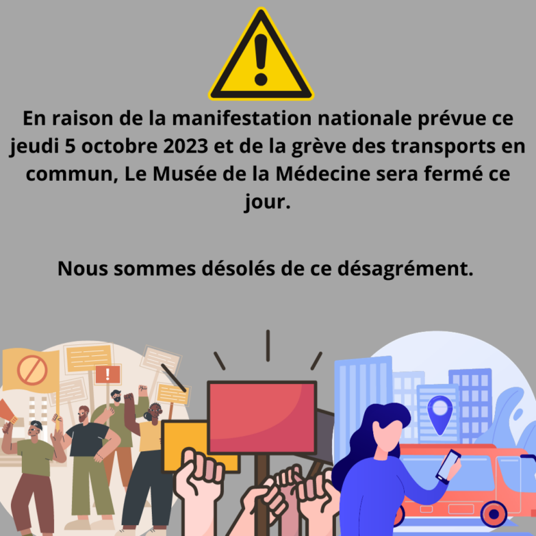 Ce jeudi 5 octobre, en raison de la Manifestation Nationale et donc de la grève des transports en commun, Le Musée de la Médecine sera exceptionnellement fermé. Veuillez nous en excuser.
