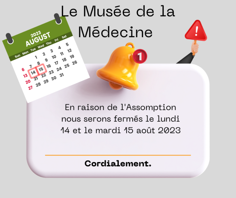Le Musée de la Médecine sera fermé ce lundi 14 août et mardi 15 août en raison de l’Assomption. Toutefois, nous vous accueillerons avec plaisir comme tous les week-ends le samedi 12 et dimanche 13 août. Cordialement, l’équipe.