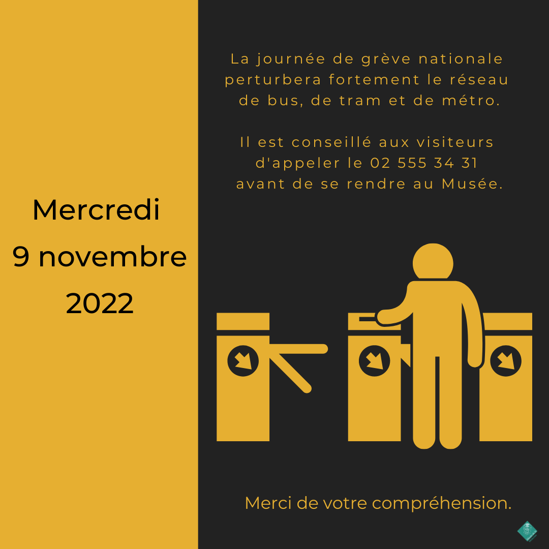 DétailsLa journée de grève nationale de mercredi 9 novembre perturbera fortement le réseau de bus, de tram et de métro. Il est conseillé aux visiteurs d’appeler le 02 555 34 31 avant de se rendre au Musée.