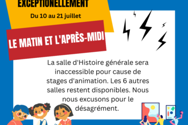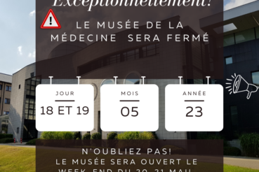 Nous attirons l’attention de nos visiteurs sur le fait que le 29 et le 30 août, la salle d’Histoire de la Médecine ne sera pas accessible aux visites pour cause de réservation. Nous nous excusons pour ce désagrément, les 6 autres salles restent à votre disposition pour une agréable visite. Nous vous souhaitons une agréable…