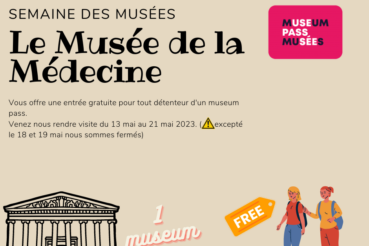 Dans le cadre de la semaine des musées qui se déroule du 15 au 21 mai 2023 (exceptés les 18 et 19 mai), le Musée de la Médecine vous offre une entrée gratuite pour une personne accompagnant un(e) détenteur(trice) d’un MuseumPassMusées. Nous vous attendons nombreux cette semaine entre 9h et 16h (dernière entrée à 15h).…