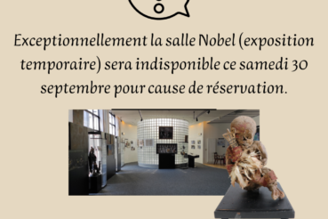 Attention suite à une réservation, la Salle Nobel (exposition temporaire) sera inaccessible ce samedi 30 septembre après-midi Nous nous excusons de ce petit désagrément, n’hésitez pas à nous rendre visite les 6 autres salles restent disponibles et l’exposition temporaire sera visible à nouveau dimanche. Bonne journée à tous et toutes. Le Musée de la Médecine.