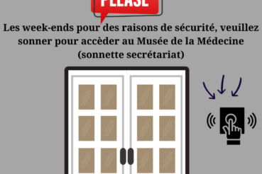 Bonjour à toutes et tous. Suite à quelques soucis de sécurité, le Musée de la Médecine vous demandera dorénavant de sonner pour avoir accès aux visites le week-end. (sonnette à coté de la porte de droite « Secrétariat ») Nous vous remercions d’avance pour votre attention. Cordialement, Le Musée de la Médecine