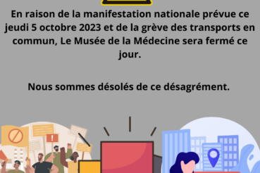 Ce jeudi 5 octobre, en raison de la Manifestation Nationale et donc de la grève des transports en commun, Le Musée de la Médecine sera exceptionnellement fermé. Veuillez nous en excuser.