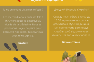 Tu es un enfant ukrainien réfugié ? Les mercredi après-midi, de 13h à 16h, viens jouer le détective au Musée de la Médecine. Nous te proposons un jeu de piste pour découvrir nos salles. Tu repartiras avec une surprise. Для дітей-біженців з України? Cереду після обіду, з 13:00 до 16:00, приходьте пограти в детектива…