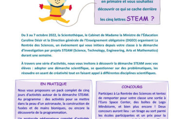 Vous enseignez en maternelle ou en primaire et vous souhaitez découvrir ce qui se cache derrière les cinq lettres STEAM ? Du 3 au 7 octobre 2022, la Scientothèque, le Cabinet de Madame la Ministre de l’Éducation Caroline Désir et la Direction générale de l’Enseignement obligatoire (DGEO) organisent La Rentrée des Sciences, un événement…