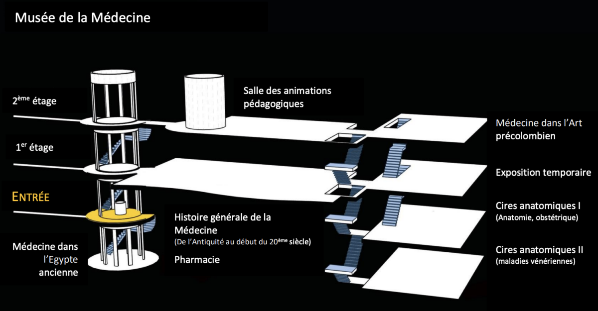 Un patrimoine de plus de 4000 objets d’Art et d’Archéologie, de la haute Antiquité à nos jours, est exposé dans 7 salles : divinités protectrices de la santé, bustes de pionniers, premières pratiques médicales, terres cuites et autres objets illustrant des maladies de l’époque, objets utilisés par les premiers médecins, gravures et tableaux représentant des scènes médicales, auxquelles s’ajoutent plus de 300 cires anatomiques du 19e siècle, 80 terres cuites illustrant l’art de guérir des précolombiens…