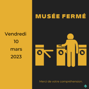 Mar62023newsNon catégoriséSuite à la grève nationale, le vendredi 10 mars, le Musée sera fermé. Merci pour votre compréhension. Partager ce post Share on FacebookShare on Facebook Share on XShare on X Articles similairesFermeture exceptionnelle et férié29 octobre 2024Halloween Party 20241 octobre 2024I Love Science 202430 septembre 2024Salle indisponible13 septembre 2024