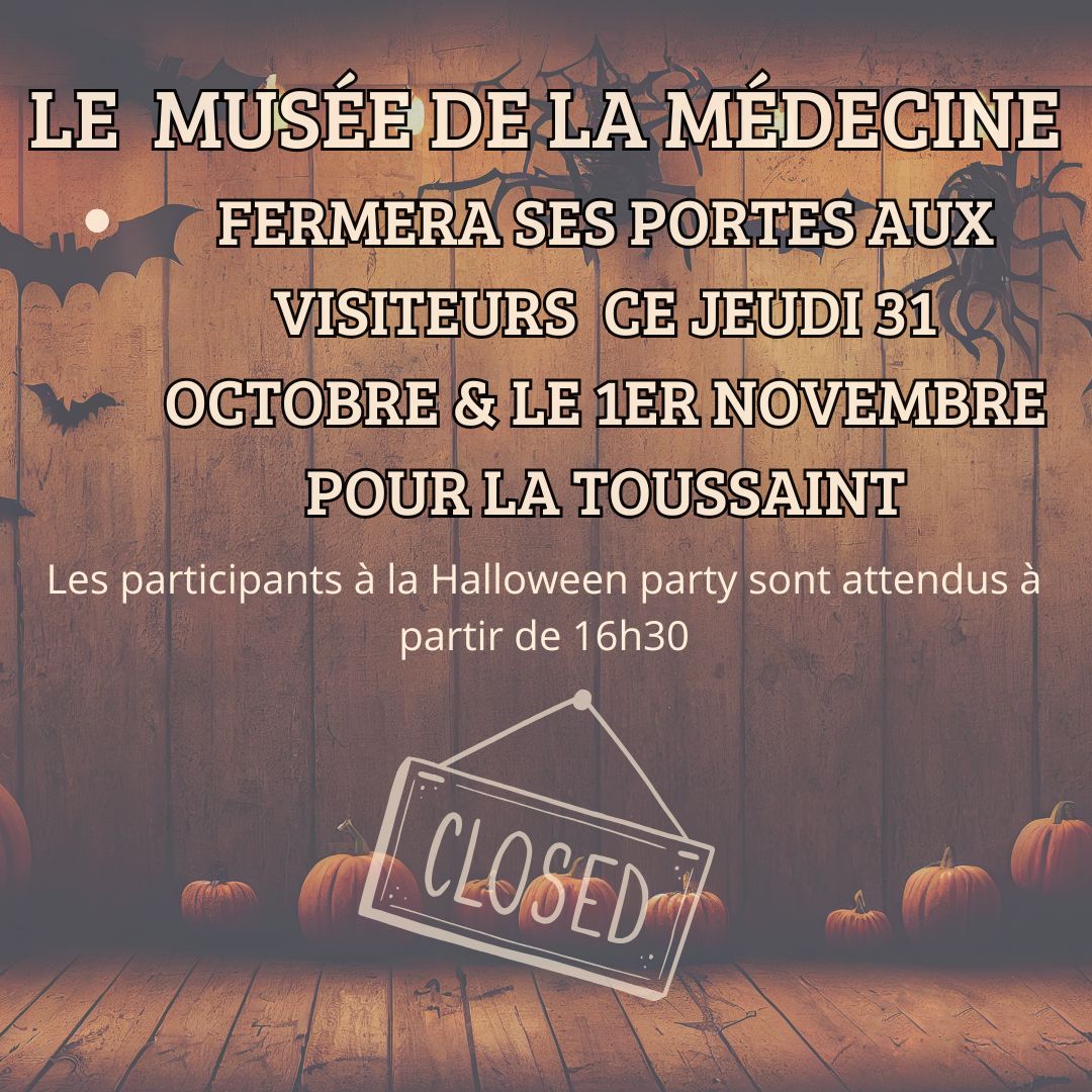 Le Musée de la Médecine sera fermé pour les visiteurs ce 31 octobre 2024 en vue de l’Halloween party ainsi que le 1er novembre à l’occasion de la Toussaint.